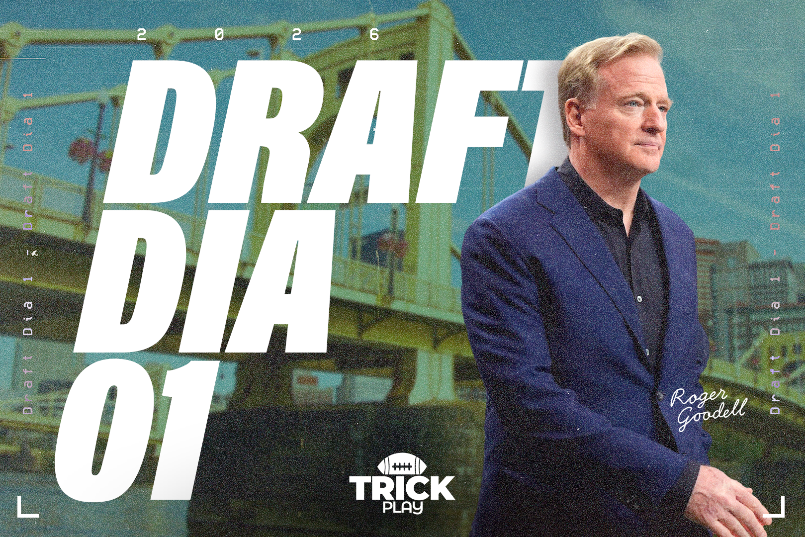 Roger Goodell já está no palco em Pittsburgh. Ao lado dele, TJ Watt e Cameron Heyward fazem a abertura.